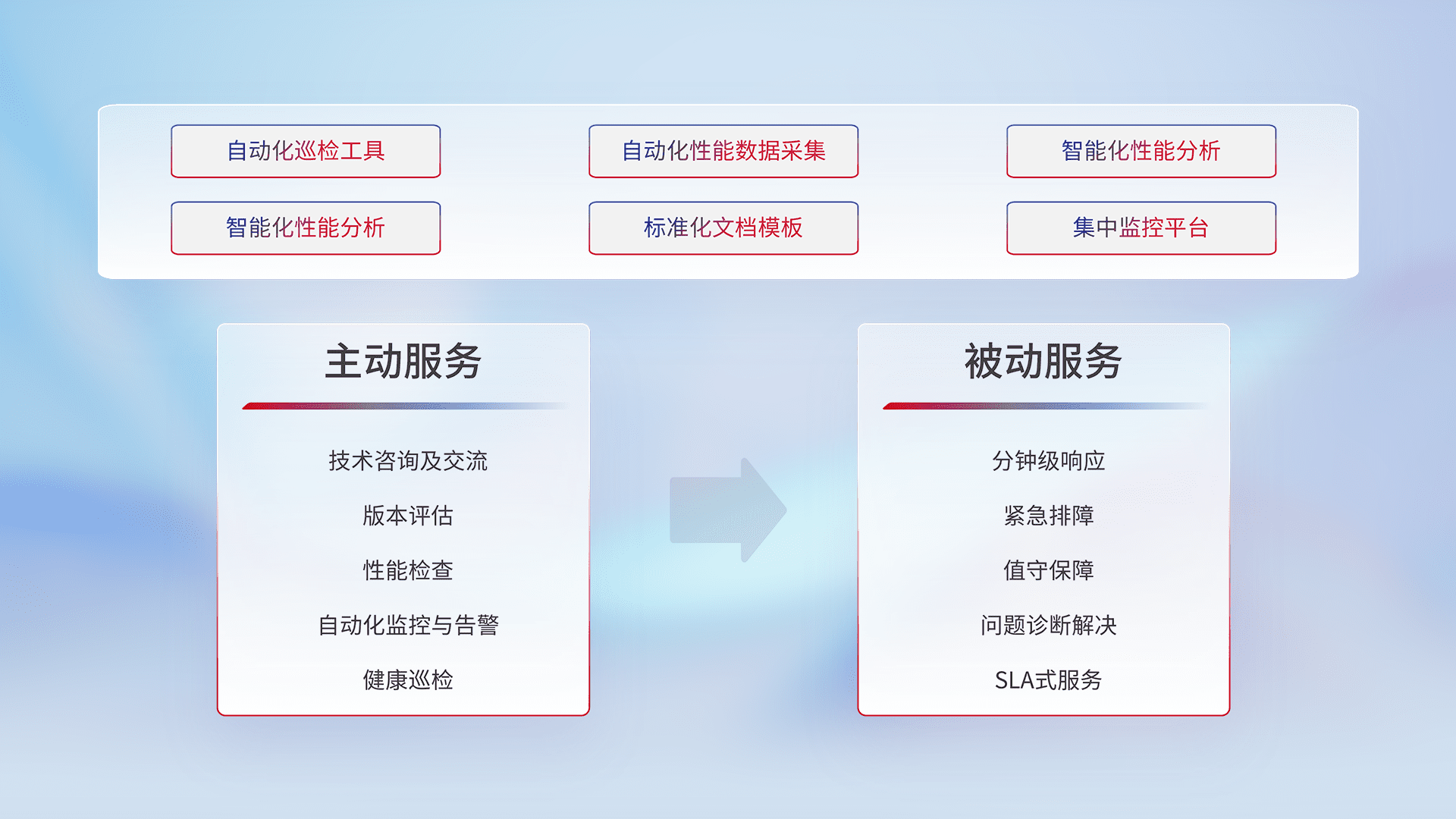 智能化工具和标准化文档,,保障服务质量,,,,提供主动服务(包含技术咨询、、、、版本评估、、性能检查、、、、自动化监控与告警、、健康巡检)和被动服务包含(分钟级响应、、、紧急排障、、、、值守保障、、问题诊断解决、、、、SLA服务)。。