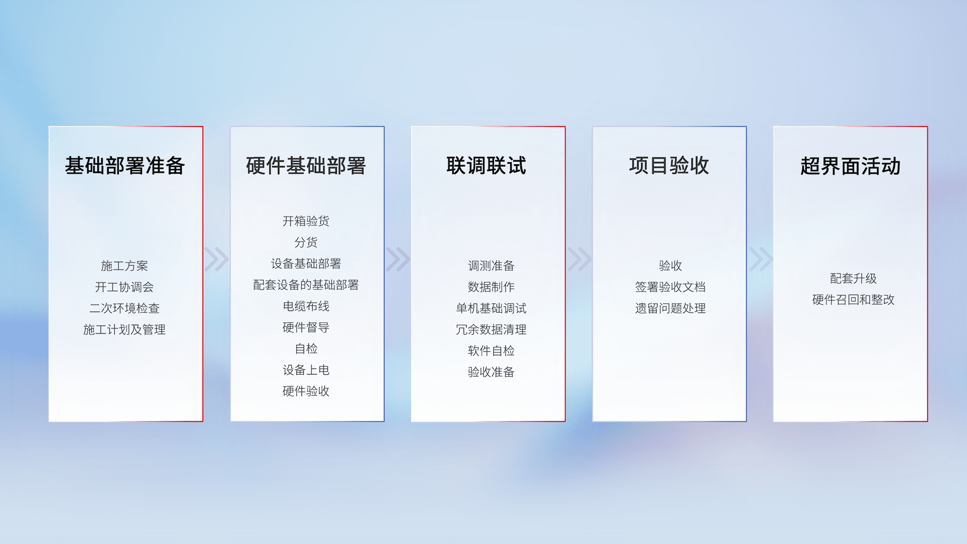 从基础部署准备、、、、硬件基础部署、、、、联调联试、、项目验收、、、、越界面活动的全过程可追溯,,保证施工质量和进度。。。